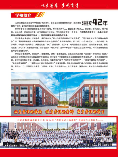 石家莊教聯(lián)高級(jí)職業(yè)中學(xué),作為省級(jí)重點(diǎn)中學(xué),自 1983 年創(chuàng)立以來(lái),建校42年,始終致力于為學(xué)生提供優(yōu)質(zhì)的職業(yè)教育與升學(xué)渠道。2025 年秋季招生現(xiàn)已全面開(kāi)啟,期待有志青年的加入!